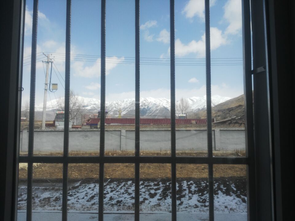 將近四月,剛剛下了一場雪,窗外不遠處看到漂亮的雪山。