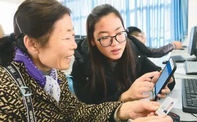 江蘇省鎮(zhèn)江市潤州區(qū)七里甸社區(qū)聯(lián)合江蘇科技大學成立老年網(wǎng)校,幫助老人們快樂上網(wǎng),豐富文化生活。下圖為志愿者向老年居民傳授智能手機上網(wǎng)購票技能。