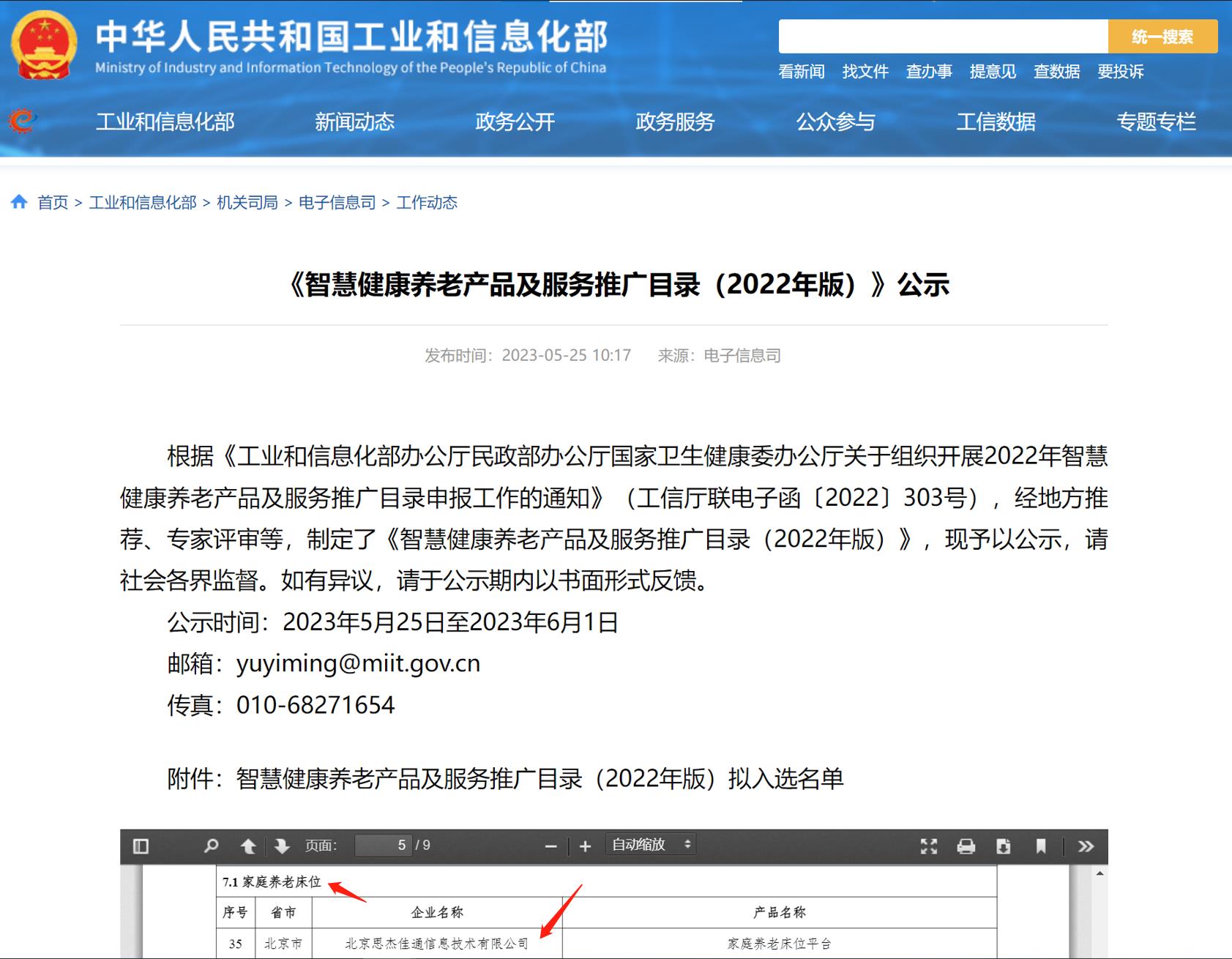 杰佳通家庭養老床位平臺入選國家三部委《智慧健康養老產品及服務推廣目錄(2022年版)》