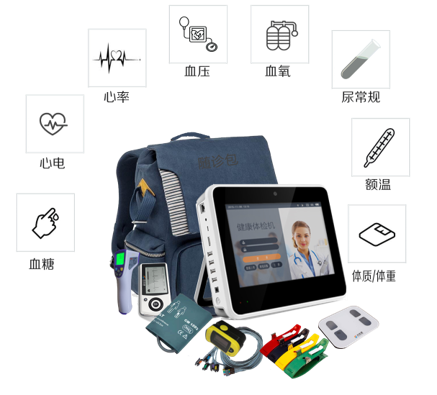 檢測內(nèi)容:身高、體重、BMI、脂肪、血壓、血氧、體溫、便攜心電、腰臀比、打印機、血常規(guī)三項(血糖、總膽固醇、尿酸),血脂四項(總膽固醇、甘油三酯、高密度、低密度),數(shù)據(jù)自動上傳到平臺。